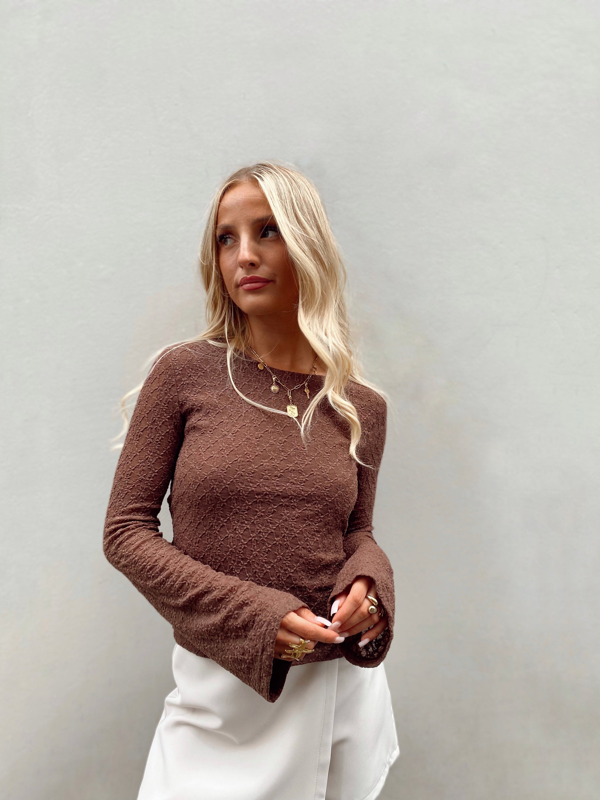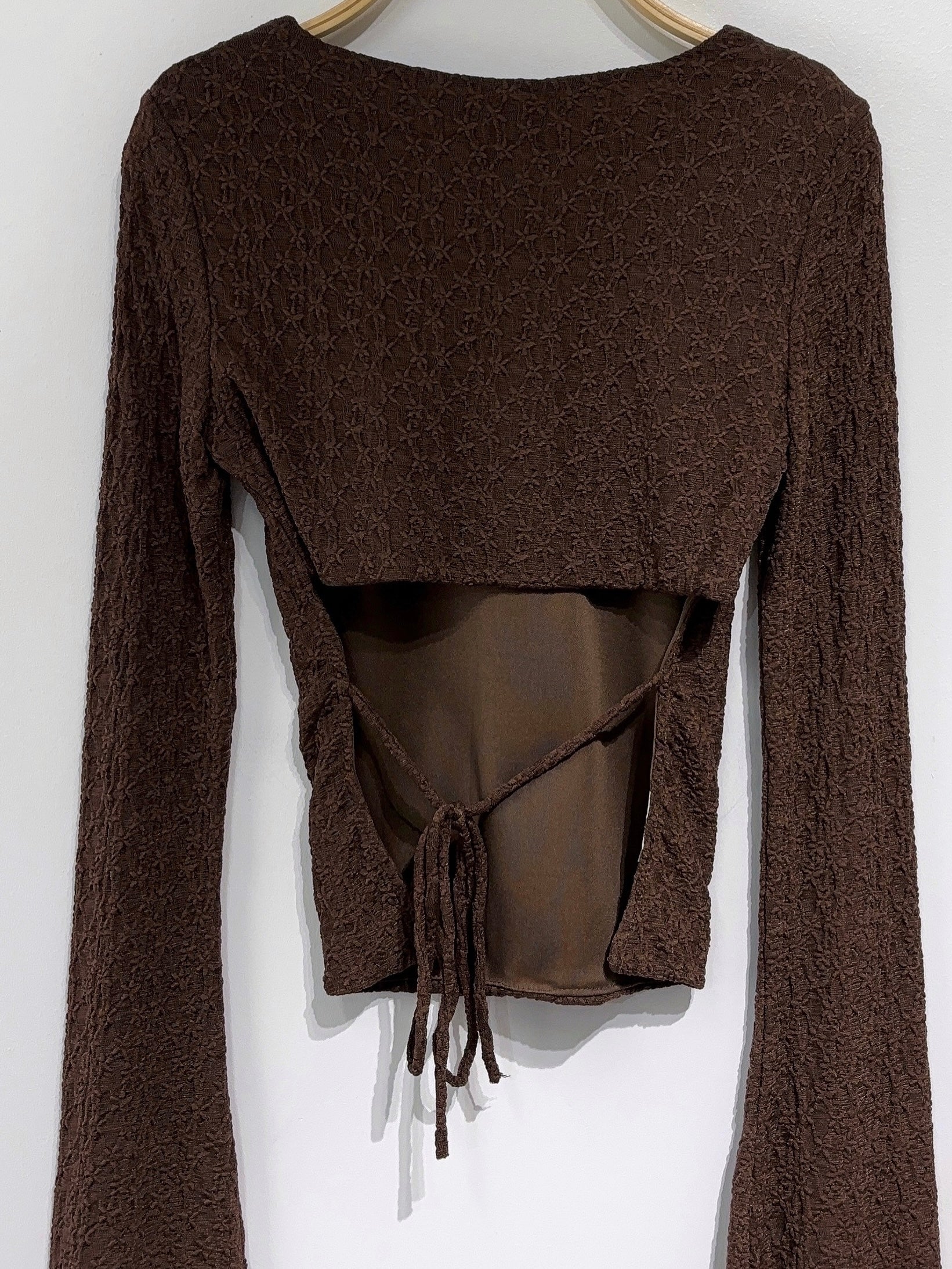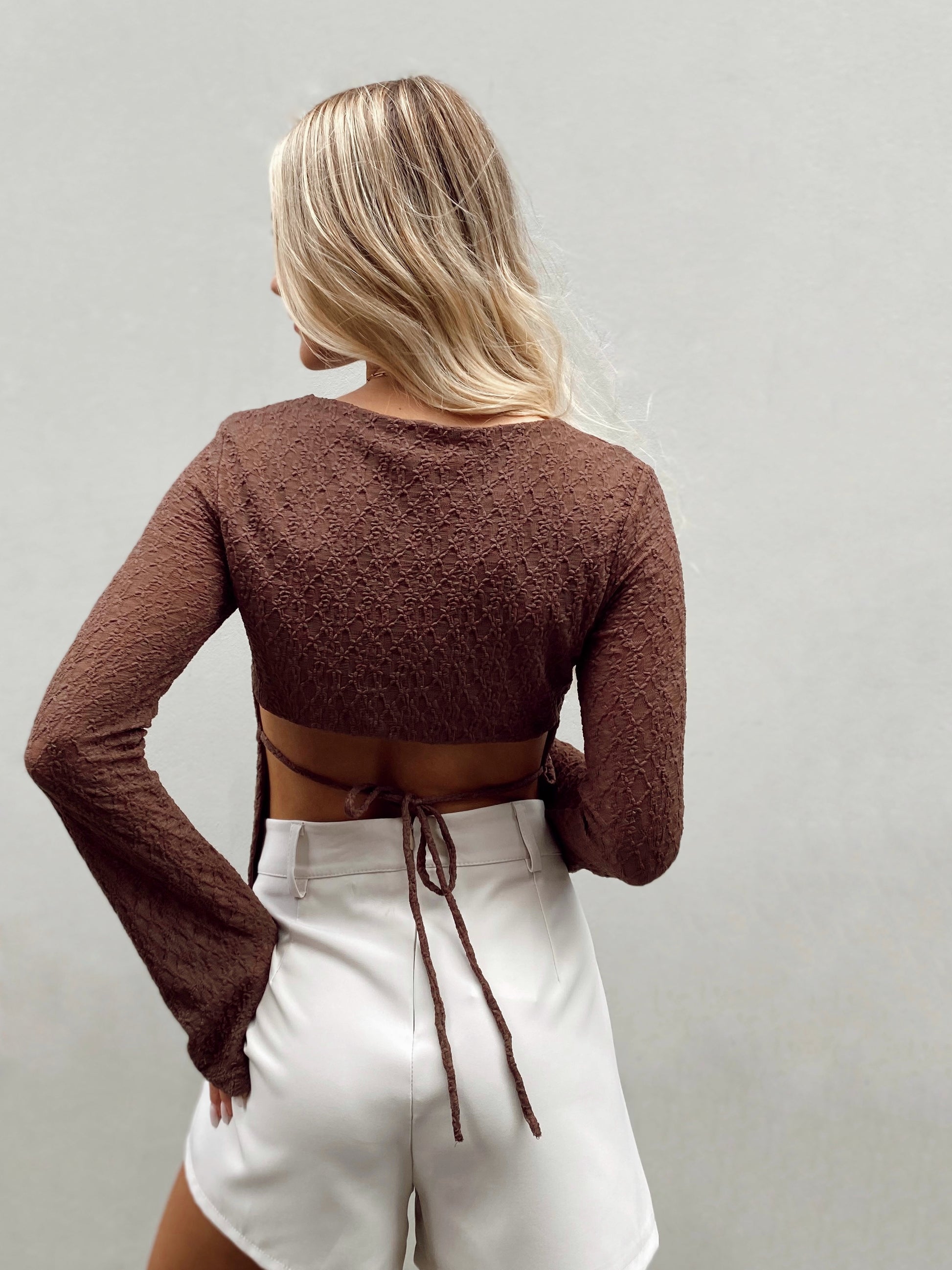 - Détails : haut dos nu à manches longue évasée, prêt du corps doublé sur l'avant et avec effet de transparence sur les bras. Il se noue dans le bas du dos.